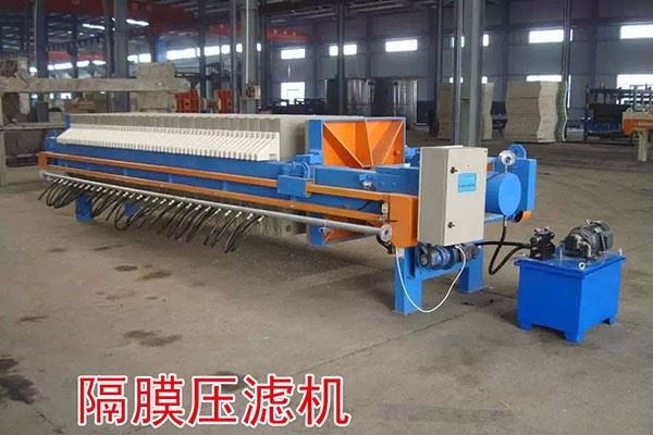 隔膜壓濾機(jī),隔膜壓榨壓濾機(jī)由隔膜板和廂式濾板排列組成濾室,在輸料泵的壓力作用下將漿料輸入濾室,通過(guò)過(guò)濾介質(zhì)(濾布)將濾料中的固體和液體分離,當(dāng)漿料中的固體形成餅后,再向隔膜通入空氣,對(duì)濾室內(nèi)的固體充分壓榨,降低含水率。對(duì)于粘性物料的過(guò)濾及對(duì)含水率要求較高的用戶,此機(jī)更有其獨(dú)特的特性。